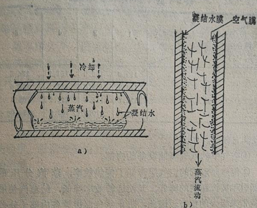 設備內蒸汽的潛熱使被加熱物加熱,蒸汽則冷卻,凝結成水,疏水閥在管壁周圍形成凝結水層(參看圖2a)。但是,若設備內部-一旦混入空氣,由于空氣是不可凝氣體(即不能液化),所以設備內管壁上的凝結水層內側又形成空氣層參看圖2b),且空氣的熱導率極小,比保溫材料還小,因而,使蒸汽和被加熱物之間的熱交換能力顯著降低。