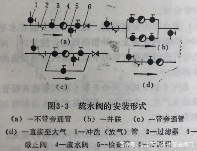 疏水閥的安裝形式主要是處理好它與旁通管、沖洗(放氣)管、檢查管或視鏡、止回閥、過濾器等的位置,如圖a所示。