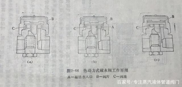 當(dāng)蒸汽開(kāi)始供氣時(shí),首先在較低的壓力下空氣和冷凝結(jié)水流入疏水閥,通過(guò)進(jìn)入口孔托起閥片B,見(jiàn)圖2-66(a),并且從中間流到環(huán)形閥座C之空間里,再由出口孔排出。