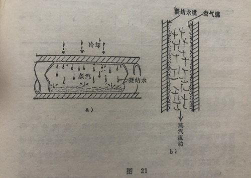 設備內蒸汽的潛熱使被加熱物加熱,蒸汽則冷卻,凝結成水,在管壁周圍形成凝結水層(參看圖21)。但是,若設備內部一旦退入空氣,由于空氣是不可凝氣體(即不能液化),所以設備內管壁上的凝結水層內側又形成空氣層(參看圖21b),且空氣的熱導率極小,比保溫材料還小,因而,使蒸汽和被加熱物之間的熱交換能力顯著降低。