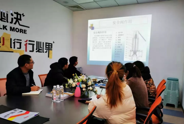 開課之后王老師非常認真的從安全閥的種類及安裝方向、蝶閥的作用等方面為現場學習的員工們進行了細致的講解。安全閥的作用,壓力超過規定值就會發出警報作用,而防止壓力超出范圍,起到保護作用。整定壓力是為了彈簧,合適的彈簧才不會導致在使用期間出現壓力不足等問題。課堂之中同學們也紛紛舉手提出了自己問題,王老師耐心聽取并回答了同學們問題。
